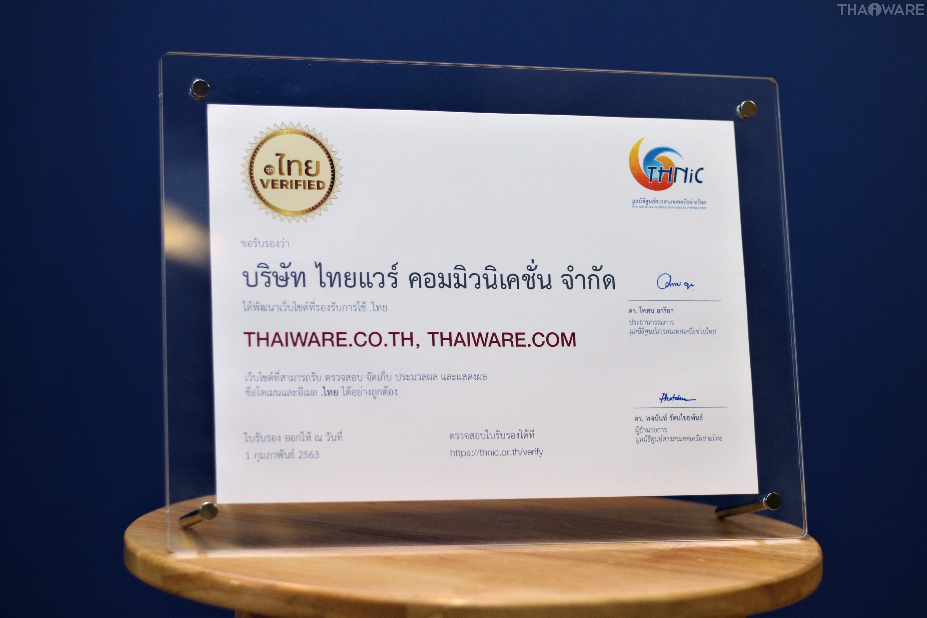 เมื่อวันที่ 29 กันยายน 2563 ดร. พจนันท์ รัตนไชยพันธ์ ผู้อำนวยการ มูลนิธิศูนย์สารสนเทศเครือข่ายไทย (THNIC Foundation) มอบประกาศนียบัตร “.ไทย Verified” ให้กับ คุณธรรณพ สมประสงค์ Managing Director บริษัท ไทยแวร์ คอมมิวนิเคชั่น จำกัด หลังจากเว็บไซต์ Thaiware.com และ Thaiware.co.th ผ่านการตรวจสอบ การรองรับ .ไทย