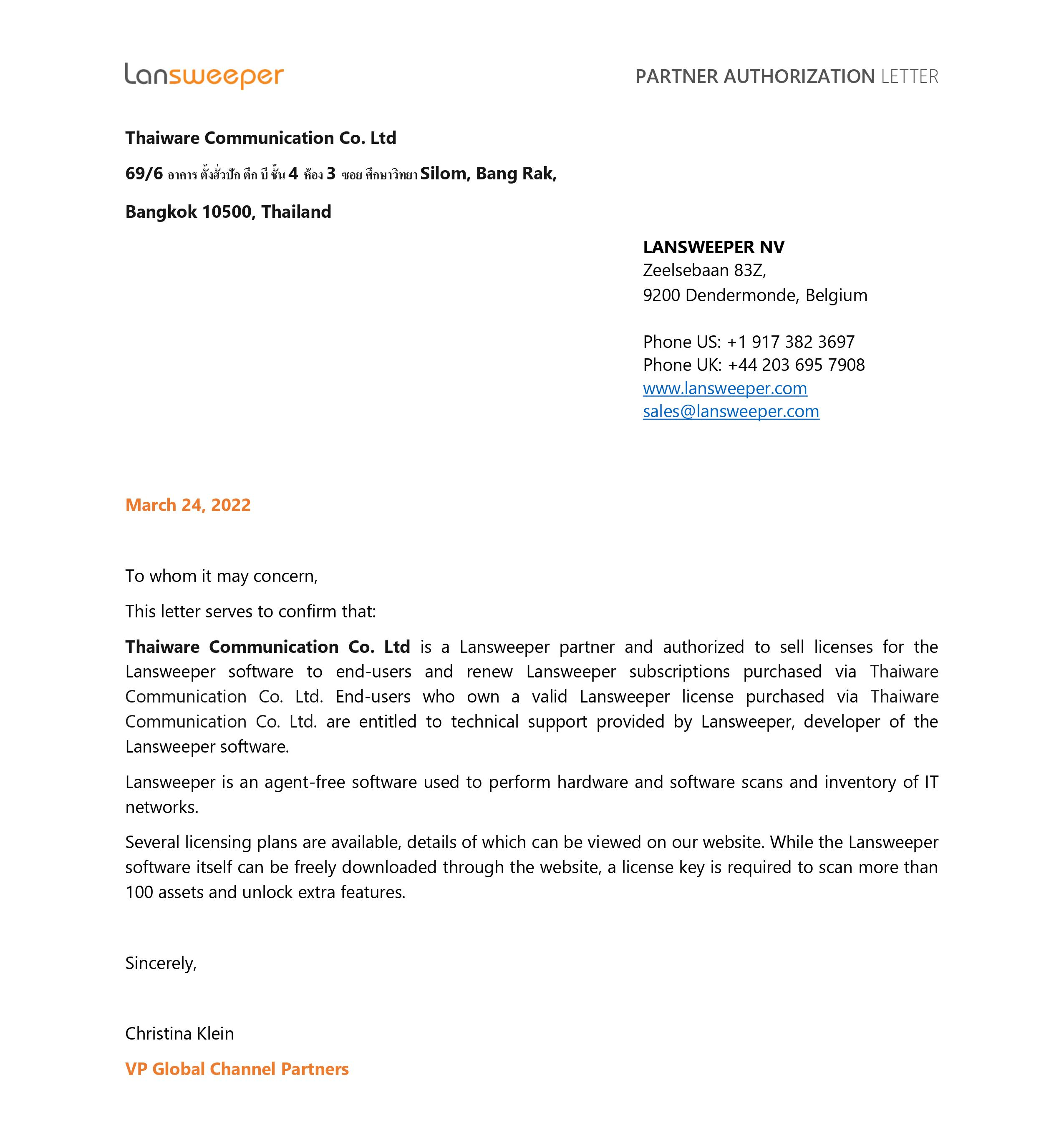 Lansweeper โปรแกรมเก็บข้อมูลอุปกรณ์ที่เชื่อมต่อ ในวงเน็ตเวิร์ก แต่งตั้ง Thaiware เป็นตัวแทนจำหน่าย อย่างเป็นทางการ ในประเทศไทย จดหมายแต่งตั้ง Thaiware เป็นตัวแทนจำหน่าย Lansweeper ในประเทศไทย