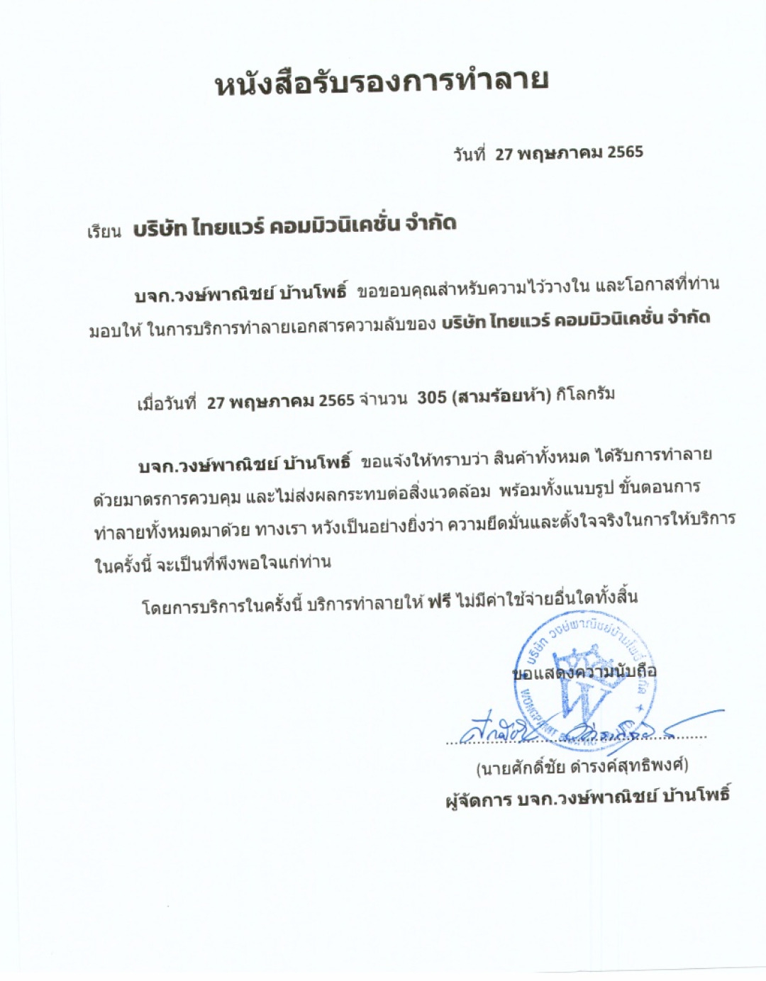 หนังสือรับรองการทำลายเอกสารที่ออกโดย บจก. วงษ์พาณิชย์ บ้านโพธิ์