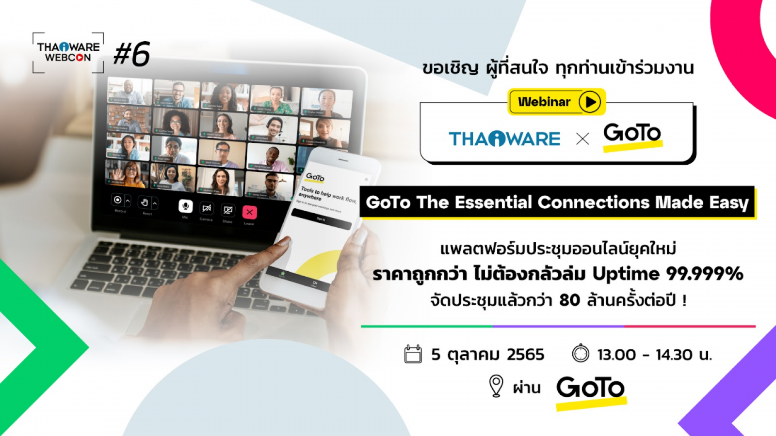 เมื่อวันพุธที่ 5 ตุลาคม ค.ศ. 2022 (พ.ศ. 2565) เวลา 13:00 น. (GMT+7) - บริษัท ไทยแวร์ คอมมิวนิเคชั่น จำกัด ผู้จำหน่ายซอฟต์แวร์ลิขสิทธิ์สำหรับผู้ใช้งานทั่วไป และผู้ใช้ในงานองค์กร จับมือกับ บริษัท GoTo (โกทู) ผู้พัฒนาแพลตฟอร์มประชุมออนไลน์ยุคใหม่ ร่วมกันจัดงานสัมมนาออนไลน์ครั้งที่ 6 ในชื่อว่า