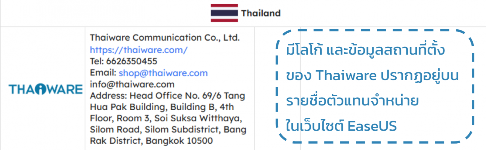 รายละเอียดบน เว็บไซต์ของ EaseUS ระบุว่า Thaiware เป็นตัวแทนจำหน่ายในประเทศไทย