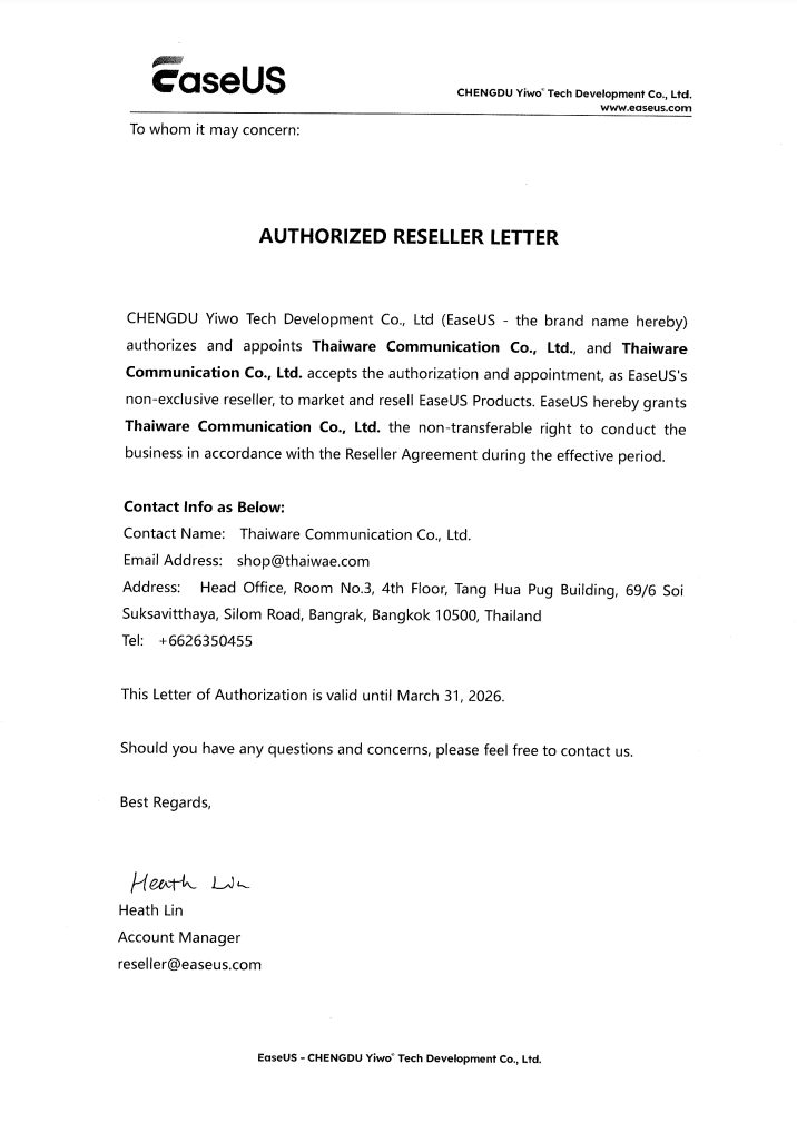เอกสารแต่งตั้ง Thaiware เป็นตัวแทนจำหน่ายซอฟต์แวร์ลิขสิทธิ์ EaseUS ในประเทศไทย